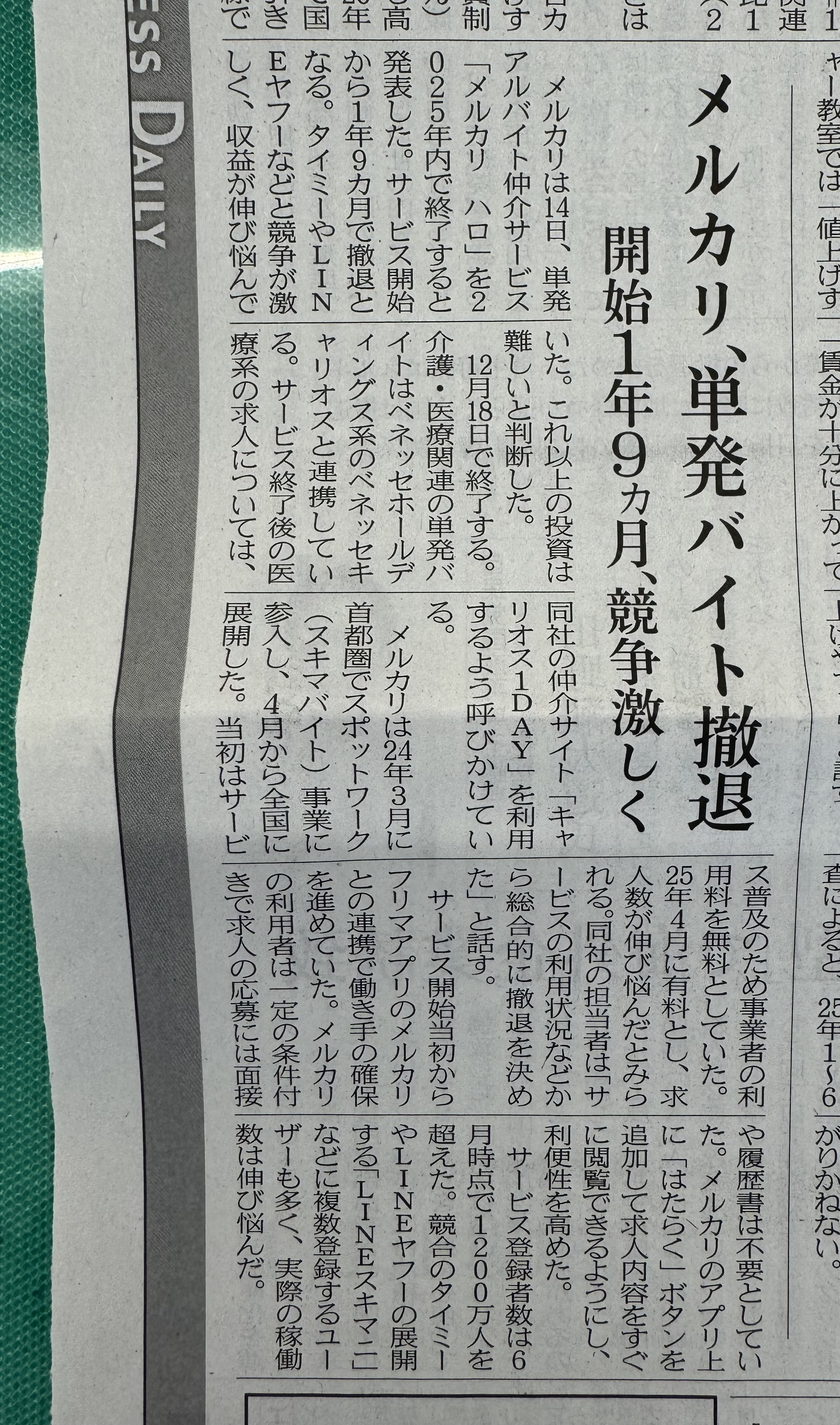 メルカリが「メルカリ ハロ」という、単発バイト事業から撤退するという記事です。