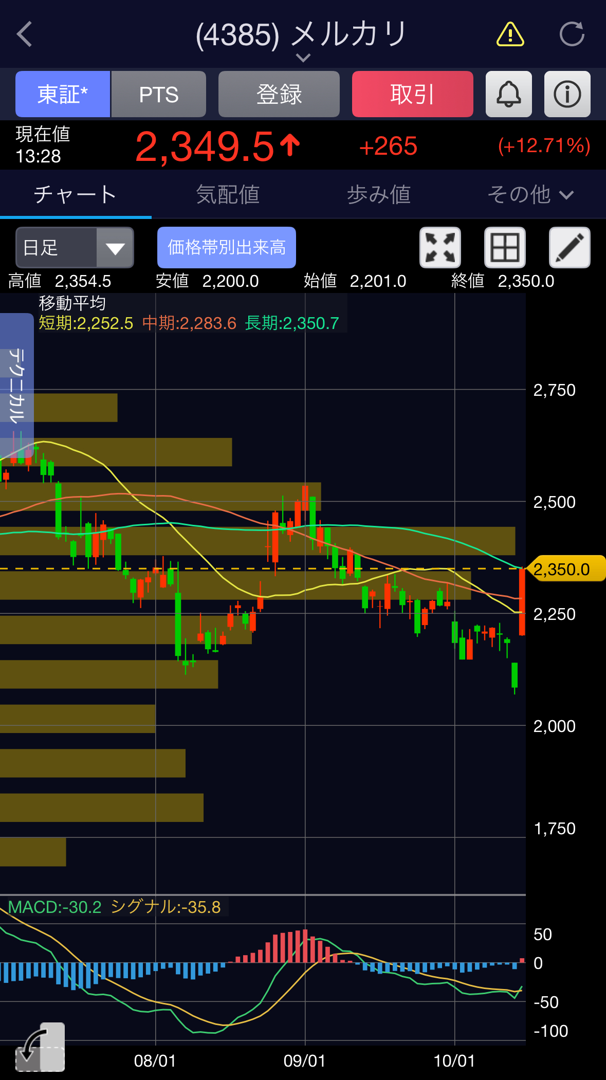 今日のメルカリの株価です。