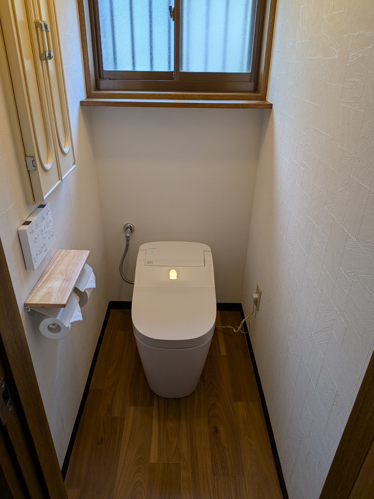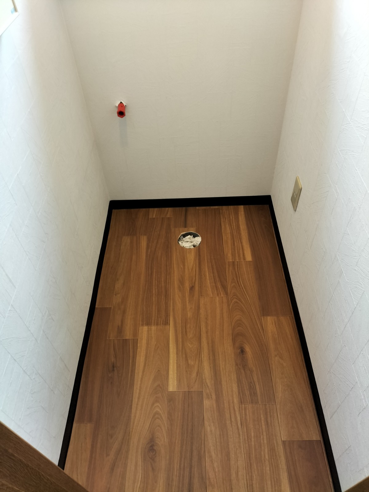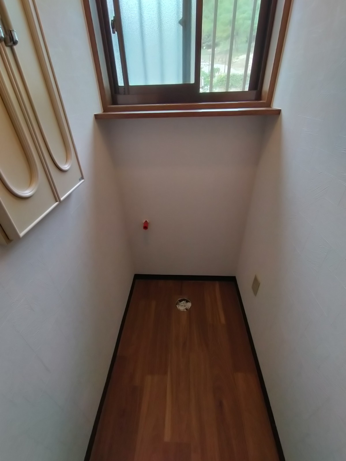 横に洗面台がありましたので、そこから分岐させて給水を確保し、洗面台のキャビネットに穴をあけ洗濯水栓を取付します。