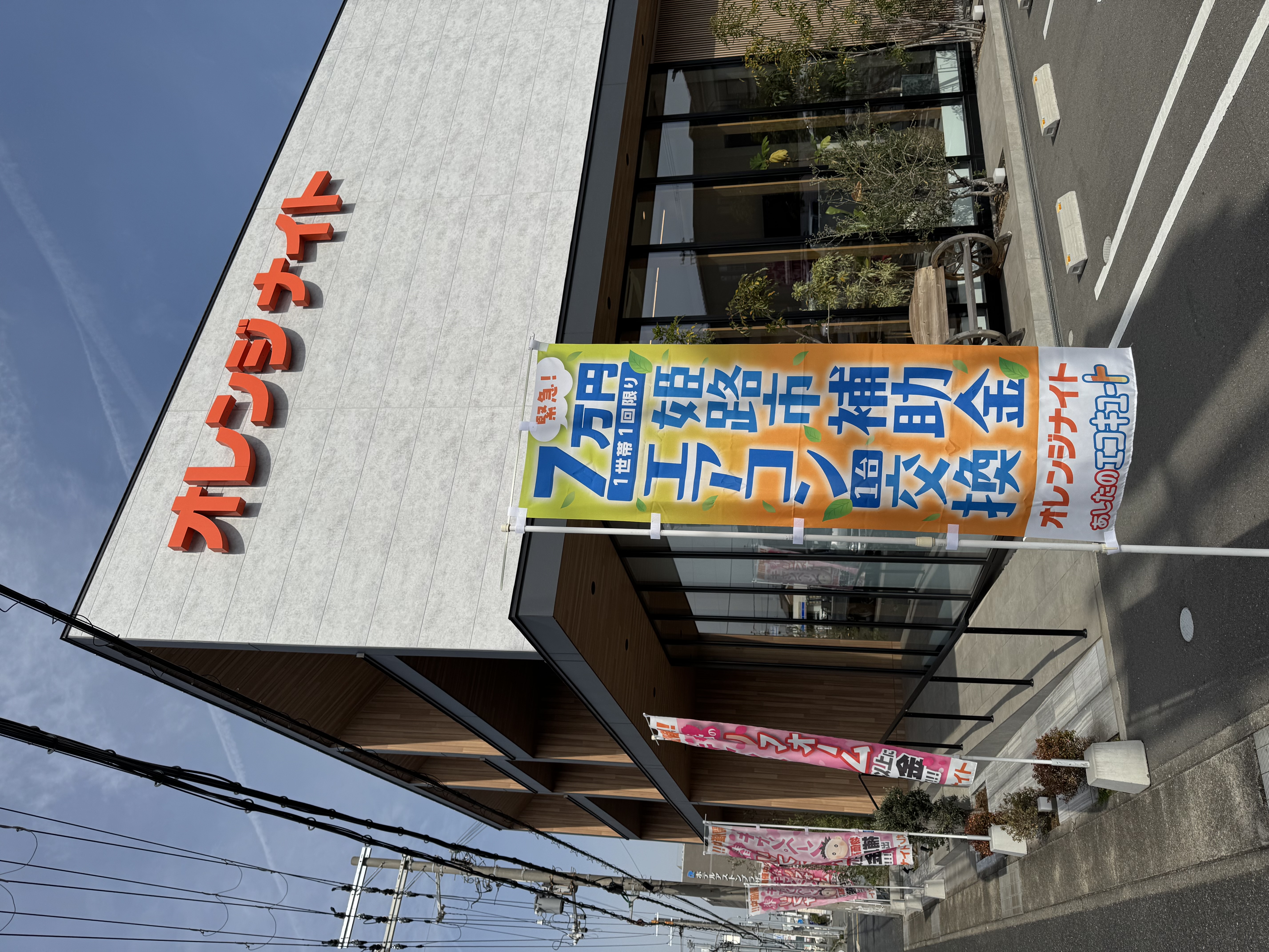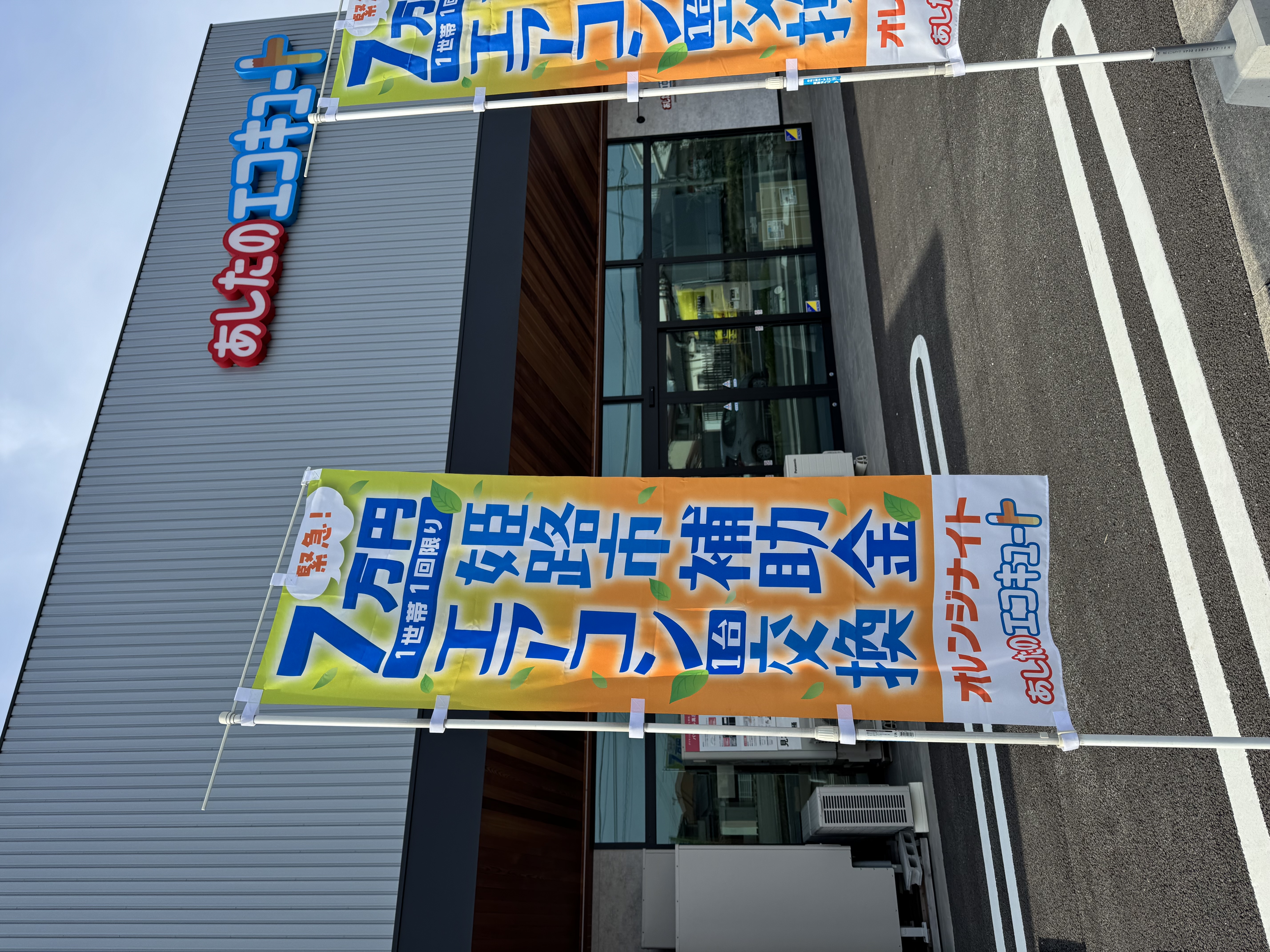 ジャーン、姫路市のエアコン、冷蔵庫の買い替えに対する補助金を告知するのぼりです。