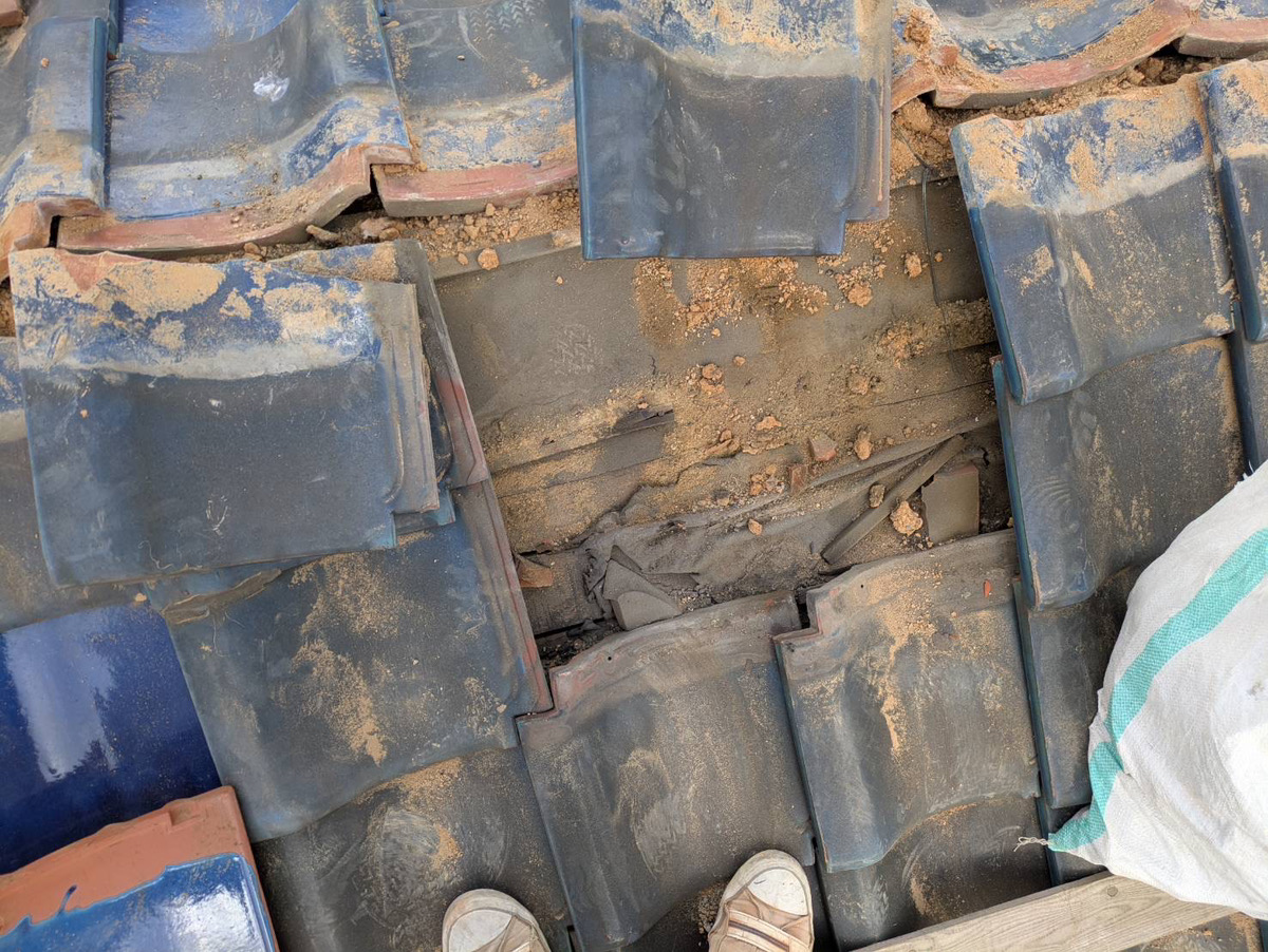 雨漏りの原因ですが、棟の下の瓦の寸法が悪く、動線を伝わり水を吸っている、のしの勾配がないことが起因でした。