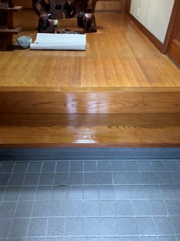 お客様が来られるとよく玄関の式台に腰を掛けてお話をされるそうで、式台や玄関框の色が褪せているから塗装をしてほしいとのことでお伺いいたしました。