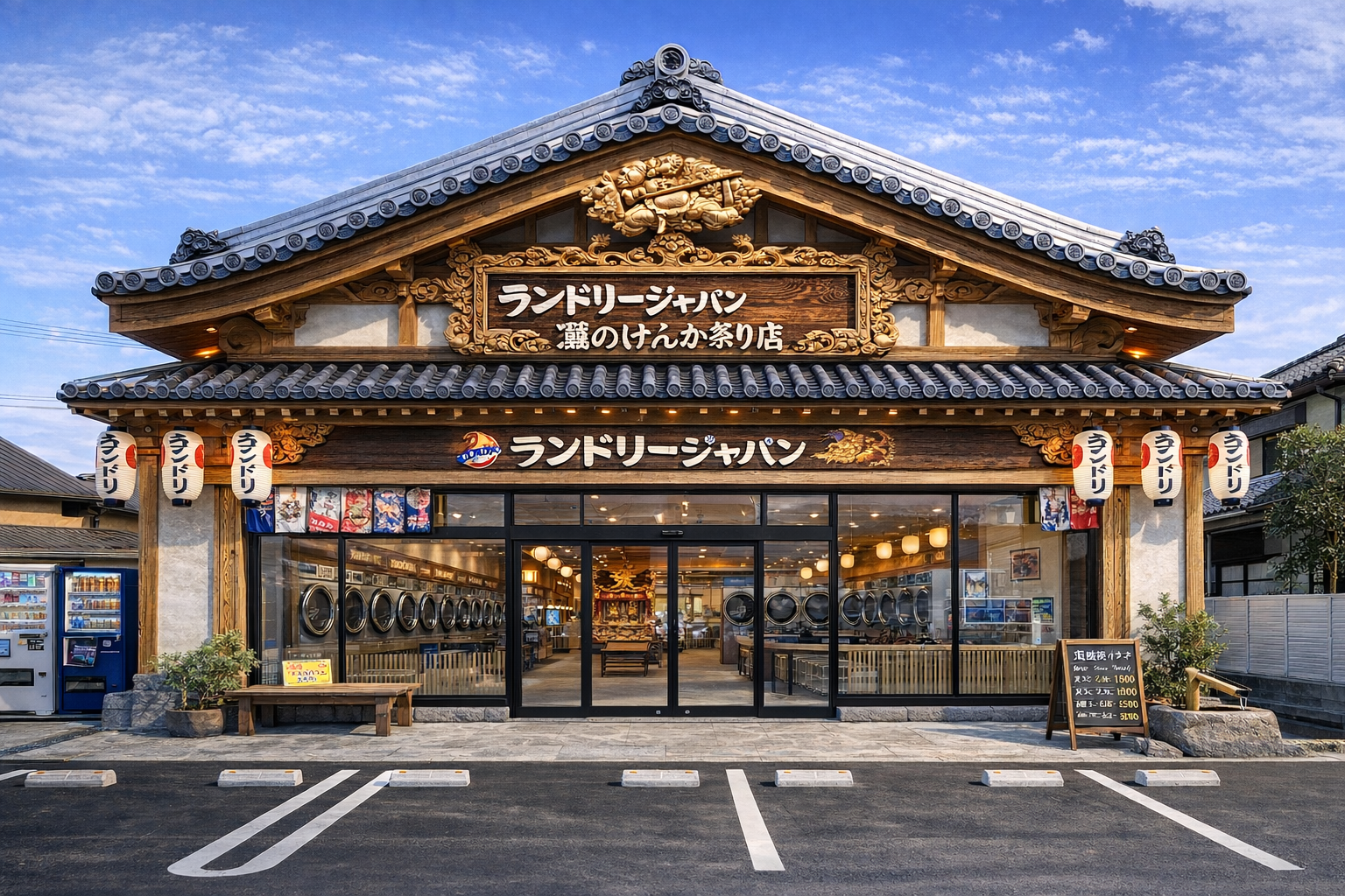 Chat GPTに、ランドリージャパンの既存の店舗を覚えさせ、私の地元である、木場の屋台蔵の写真とコラボした店舗をイメージしてもらいました。