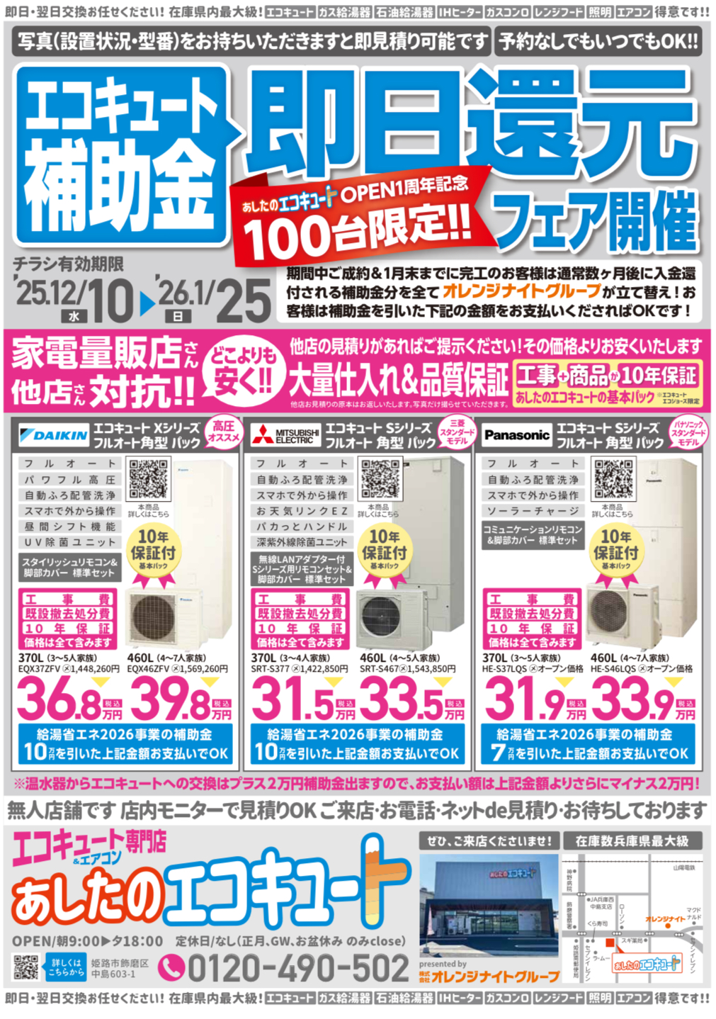 エコキュートのセールも同時開催しています。関西電力さん常駐なので光熱費の試算などご相談いただけます!
